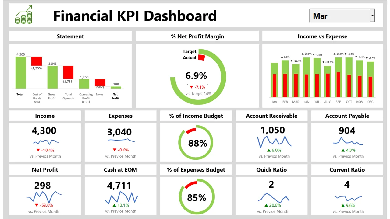 ปัญหาของการสร้าง KPI Dashboard คือจะออกแบบ Dashboard อย่างไรให้ดูน่าสนใจ ดังนั้นในหลักสูตรนี้จะสอนให้คุณได้เรียนรู้แนวคิดของการนำเสนอ KPI Dashboard ให้ออกมาแล้วดูสวยงามแบบมืออาชีพ โดยคุณจะได้เรียนรู้ตั้งแต่ขั้นตอนการเตรียมข้อมูลเพื่อสร้าง KPI การใช้สูตรขั้นสูตรต่างๆ ของ Excel ที่เกี่ยวข้อง การสร้างกราฟแบบแปลกๆ เพื่อนำเสนอ KPI ให้ดูสวยงามแบบมืออาชีพ และการสร้าง KPI Dashboard แบบ Dynamic โดยที่ข้อมูลในหน้า Dashboard จะเปลี่ยนอัตโนมัติตามเงื่อนไขได้ เช่น การเลือกเดือนที่จะแสดงข้อมูลในหน้า Dashboard และสุดท้ายจะได้นำเอา KPI Dashboard ไปพรีเซ็นต์ใน PowerPoint อีกด้วย